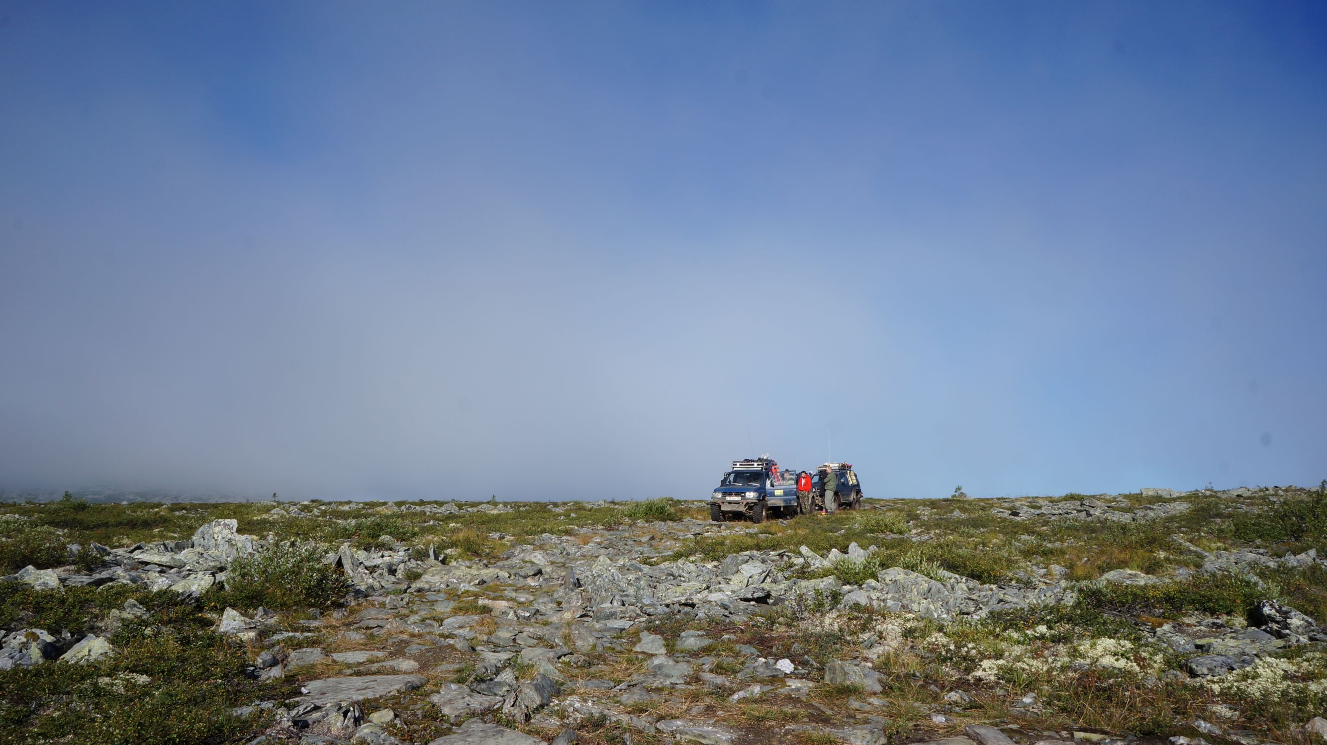 Распрощавшись, поехали дальше. Дорога шла по склону горы, и крен, вызванный рельефом, усугублялся полными бензина канистрами в боковых корзинах. Глядя вниз, и прикидывая предположительную траекторию полета машины, в случае падения, становилось не по себе. Ситуацию подогревала карта, с отметками мест, где уже кто-то когда-то переворачивался… Опыт езды по горам и курумникам у нас совсем небольшой, поэтому было страшновато. Но постепенно, волей-неволей мы привыкали к новому для нас стилю езды. Все понимали, что главное не торопиться и беречь машины. Накрапывающий дождик делал камни скользкими и добавлял остроты ощущений. Верхушки гор кутались в облака, где-то справа остался Отортен.