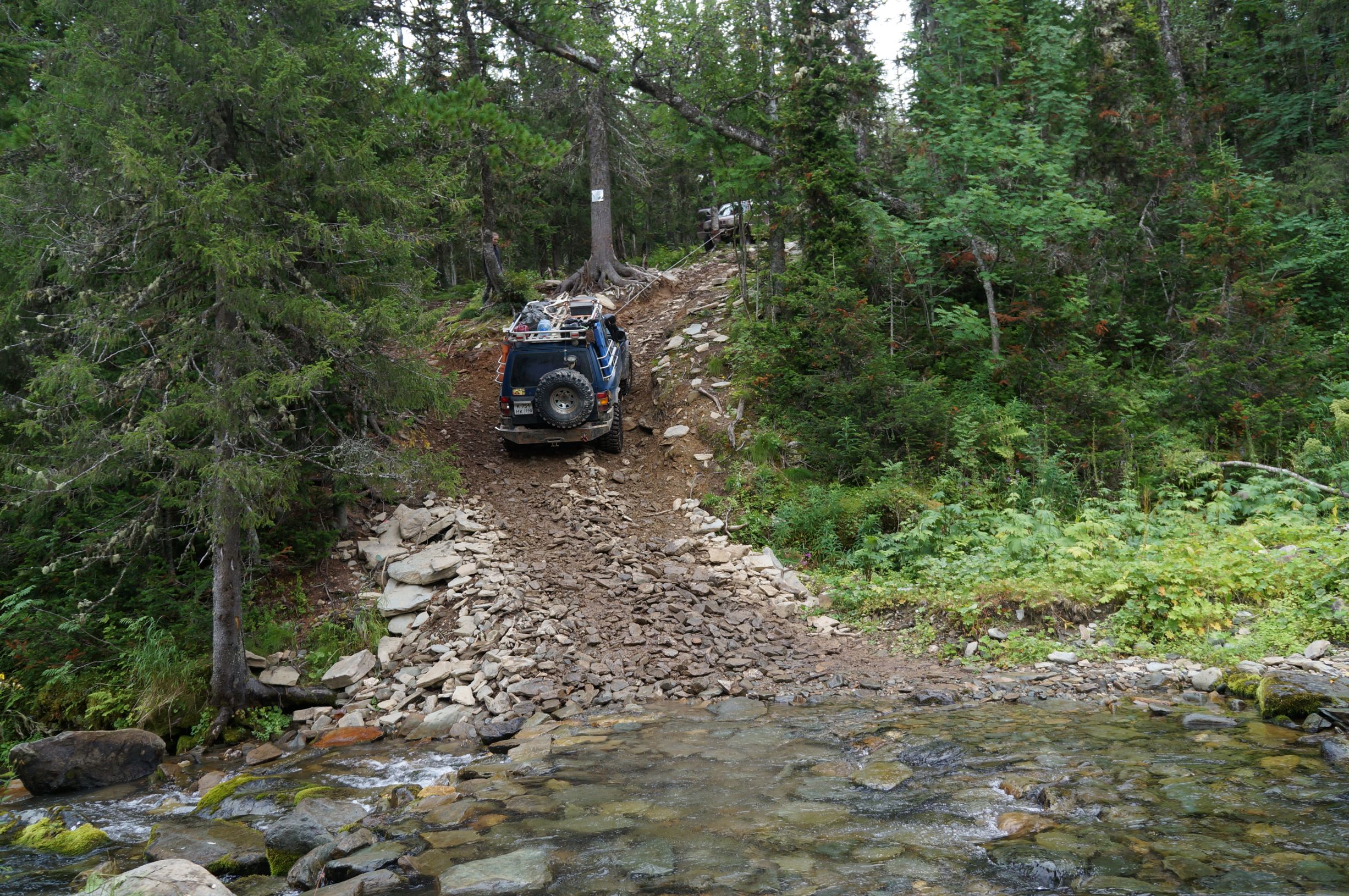 Распрощавшись, поехали дальше. Дорога шла по склону горы, и крен, вызванный рельефом, усугублялся полными бензина канистрами в боковых корзинах. Глядя вниз, и прикидывая предположительную траекторию полета машины, в случае падения, становилось не по себе. Ситуацию подогревала карта, с отметками мест, где уже кто-то когда-то переворачивался… Опыт езды по горам и курумникам у нас совсем небольшой, поэтому было страшновато. Но постепенно, волей-неволей мы привыкали к новому для нас стилю езды. Все понимали, что главное не торопиться и беречь машины. Накрапывающий дождик делал камни скользкими и добавлял остроты ощущений.