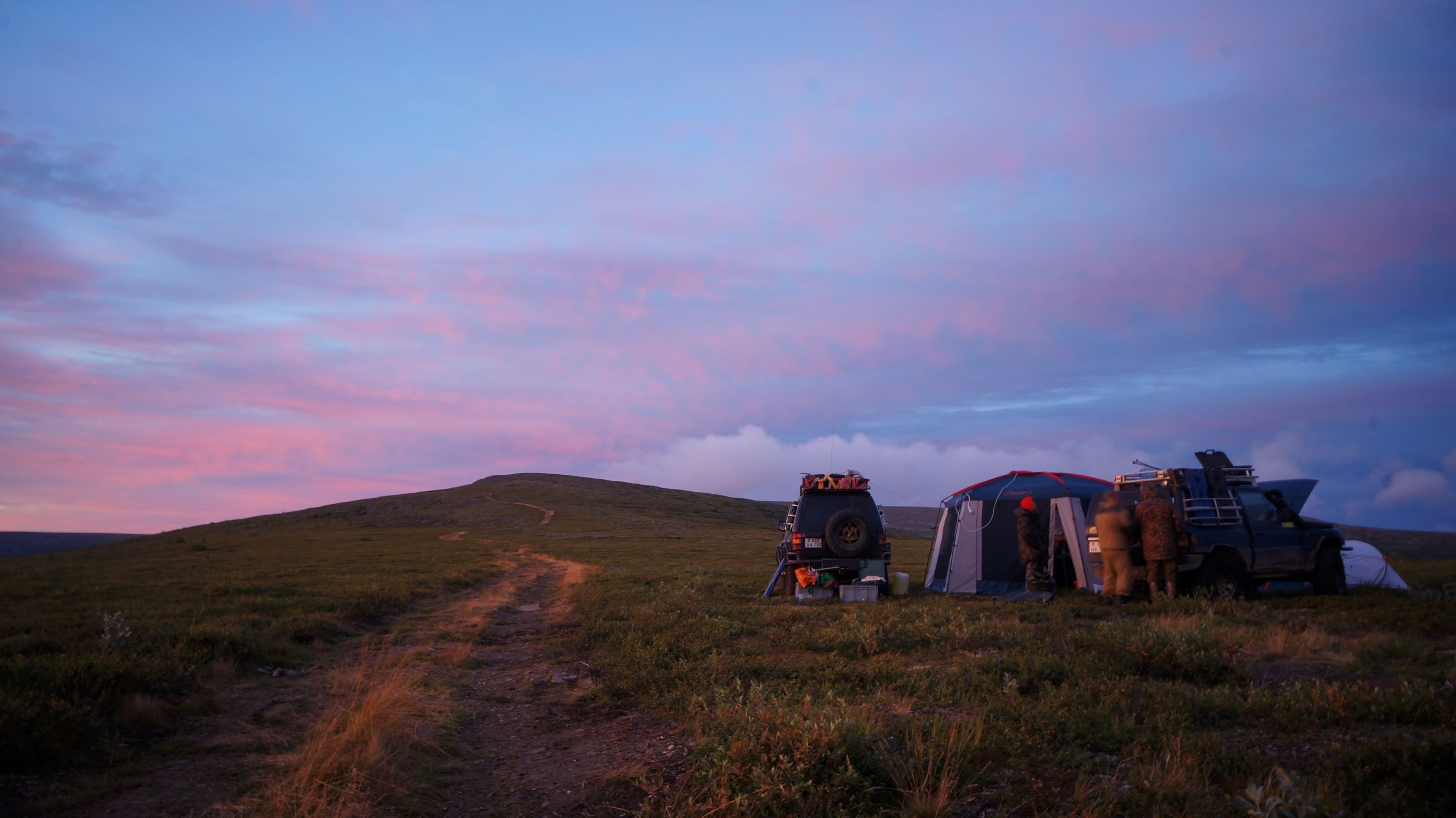 На ночевку планировали встать где-нибудь в низинке, поближе к воде и дровам где-нибудь часиков в 7-8 вечера. Как по заказу в половине восьмого такое место нашлось. Но головная машина сказала, что через шесть километров будут модули на Щебенке и хорошо бы добраться до них… Женя нехотя согласился.
