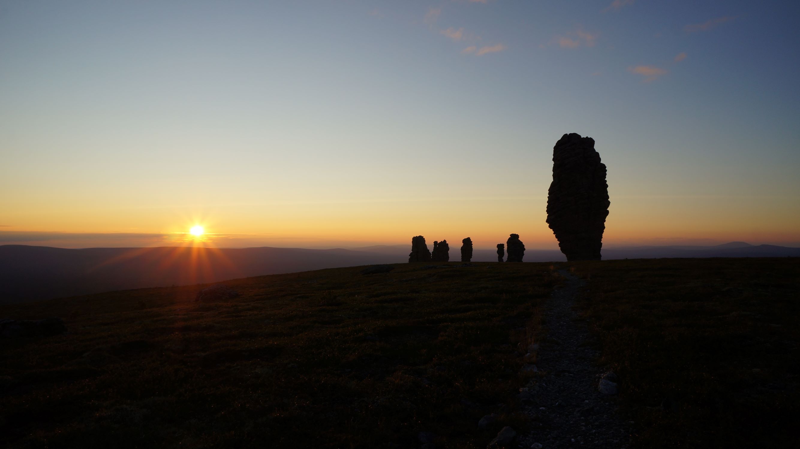 Итак, дорогу на плато мы прошли более-менее легко и пришли точно к закату. В домике нас ждал проводник Паша. Он рассказал нам правила и повел к останцам. Во всех отчетах народ пишет про эмоции, охватывающие при виде них… Наверное, они бы у меня тоже были, если бы не усталость. Ну да, порадовались, по фоткали, но не того совершенно ждали.