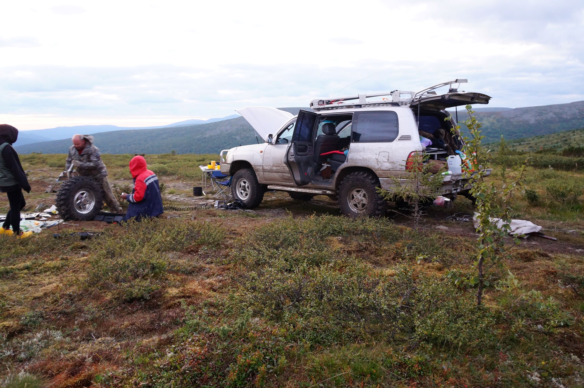 Когда возвращались в лагерь, уже издалека заметили необычное количество народу для этих мест, вокруг модулей. Оказалось, что вернулись вчерашняя Нива с Крузаком и подошла группа Игоревских пешиков.