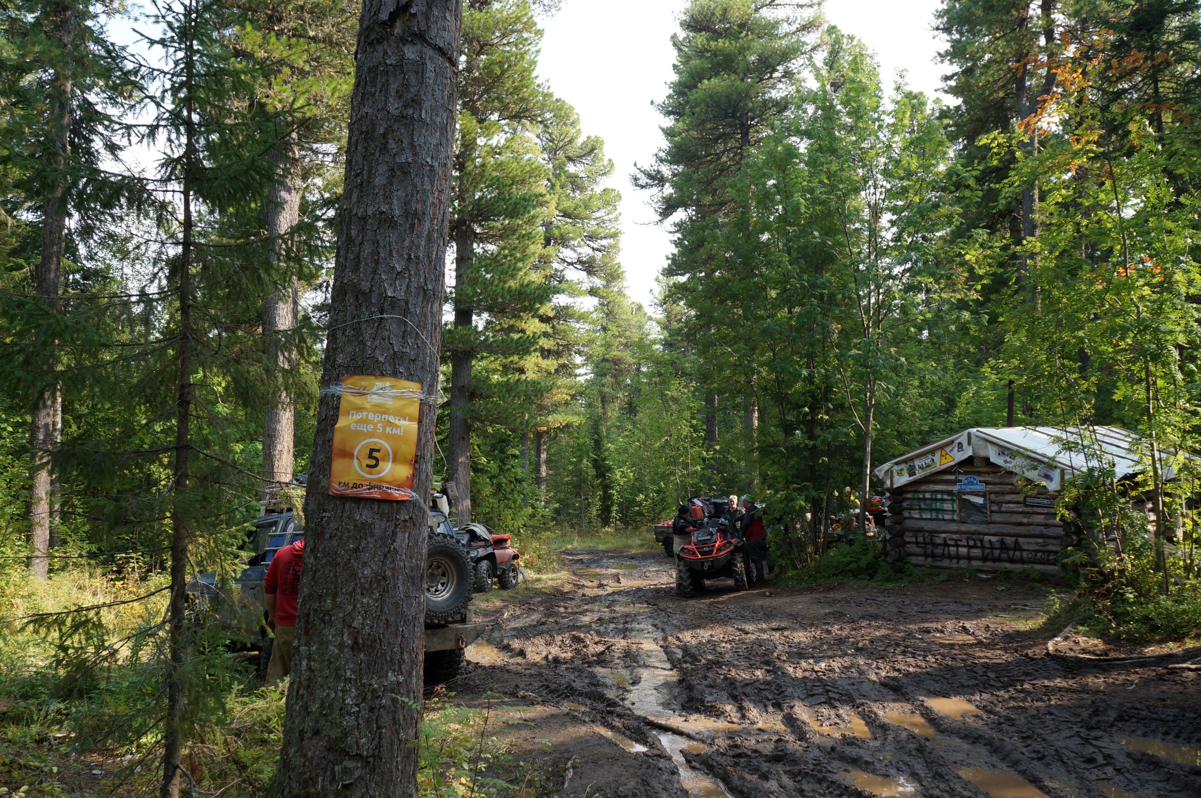 У избушки в кедровнике остановились, чтобы подтянуть стяжки на Драконе. Там уже обитала банда очередных квадров, едущих на МаньПуПуНер. Народу было полно. Немного пообщались, рассказали про то, как на этом месте три недели назад ходили смотреть на медведя, на что нам сообщили, что медведь совсем страх потерял и стал опасен, поэтому приезжали егеря его стрелять. Ночевали вместе с нашими новыми знакомыми, но поскольку в эту ночь Миша не пришел, то с утра егеря собрались и уехали. Вернутся или нет – неизвестно.