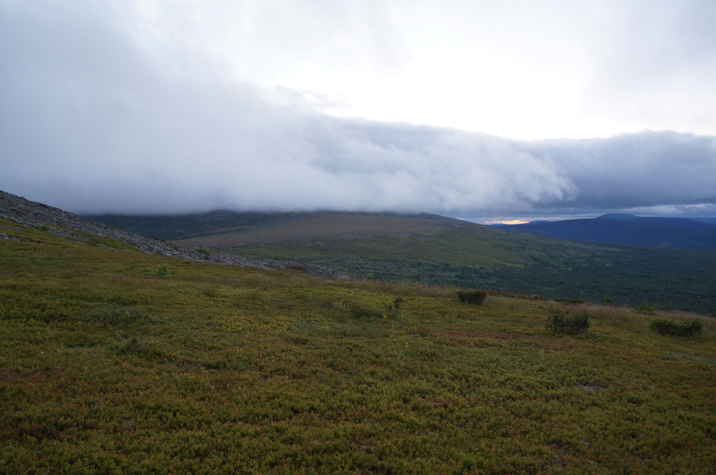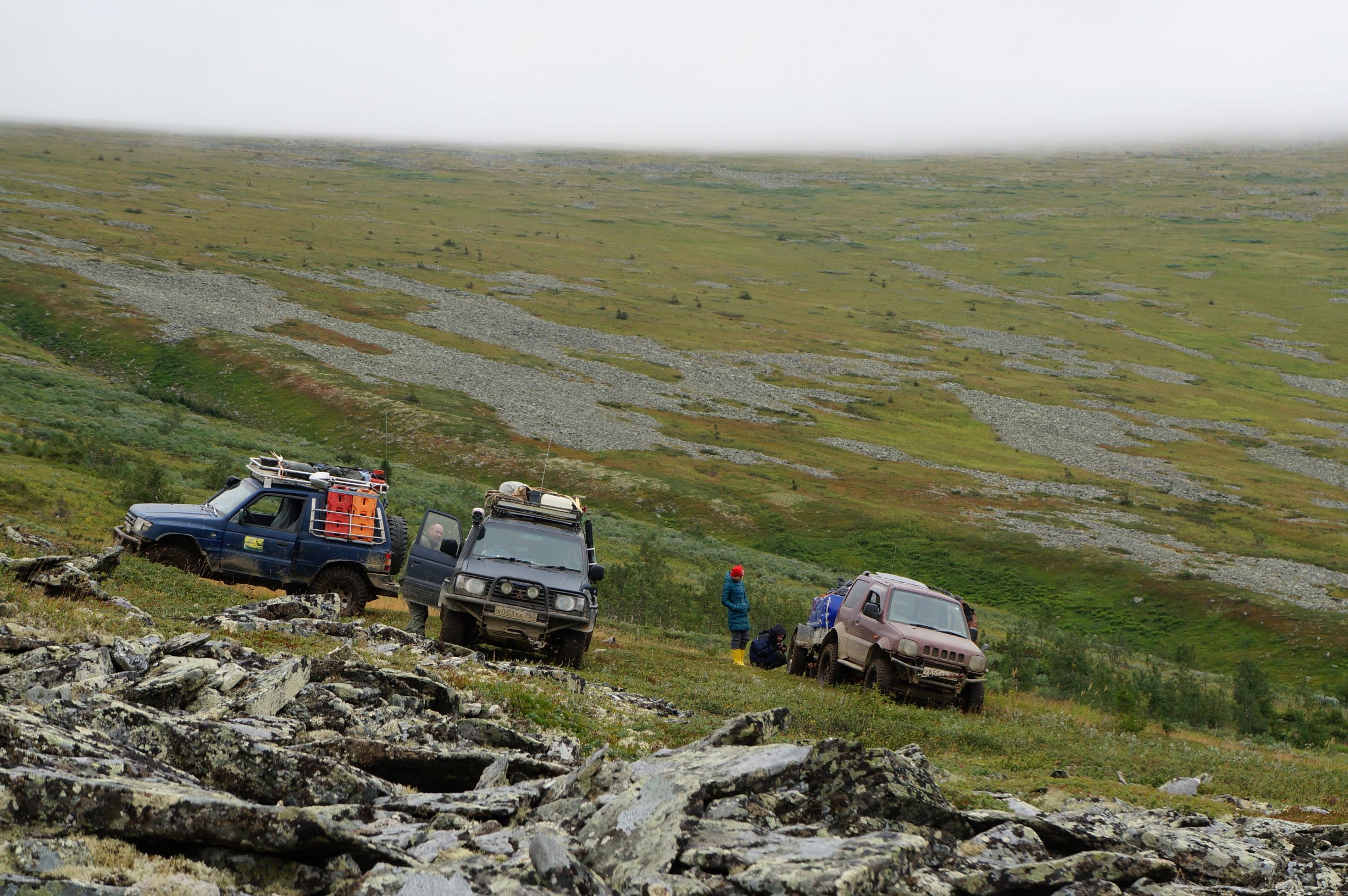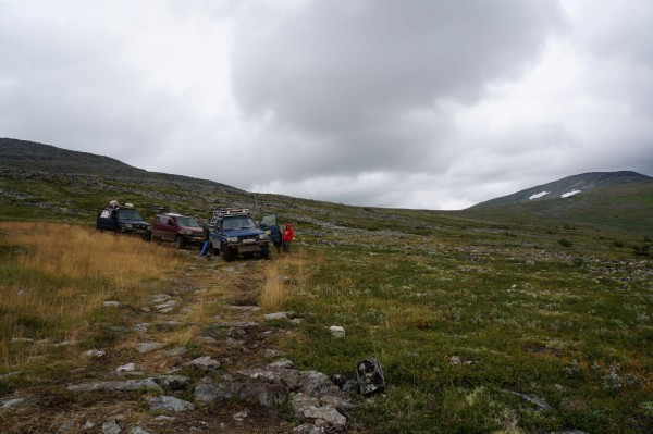 Распрощавшись, поехали дальше. Дорога шла по склону горы, и крен, вызванный рельефом, усугублялся полными бензина канистрами в боковых корзинах. Глядя вниз, и прикидывая предположительную траекторию полета машины, в случае падения, становилось не по себе. Ситуацию подогревала карта, с отметками мест, где уже кто-то когда-то переворачивался… Опыт езды по горам и курумникам у нас совсем небольшой, поэтому было страшновато. Но постепенно, волей-неволей мы привыкали к новому для нас стилю езды. Все понимали, что главное не торопиться и беречь машины. Накрапывающий дождик делал камни скользкими и добавлял остроты ощущений. Верхушки гор кутались в облака, где-то справа остался Отортен.