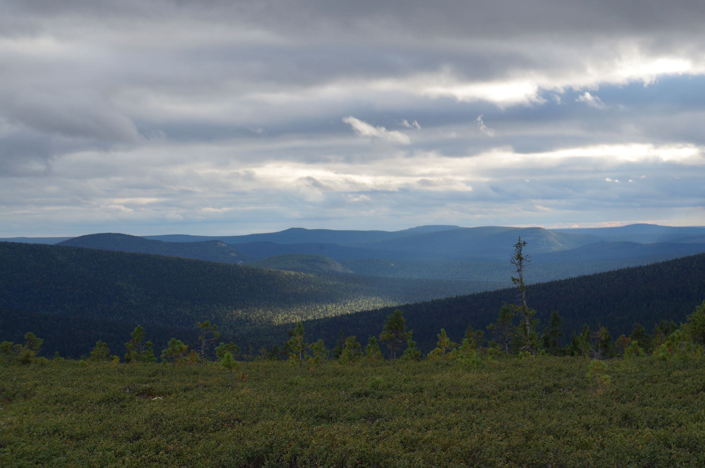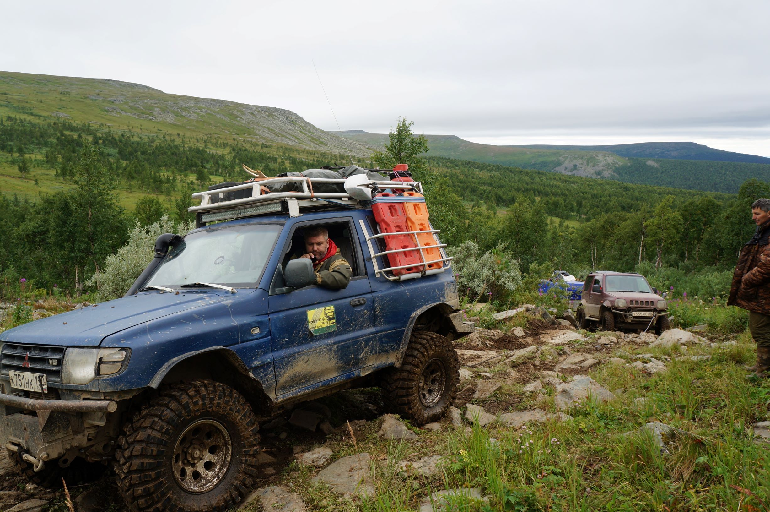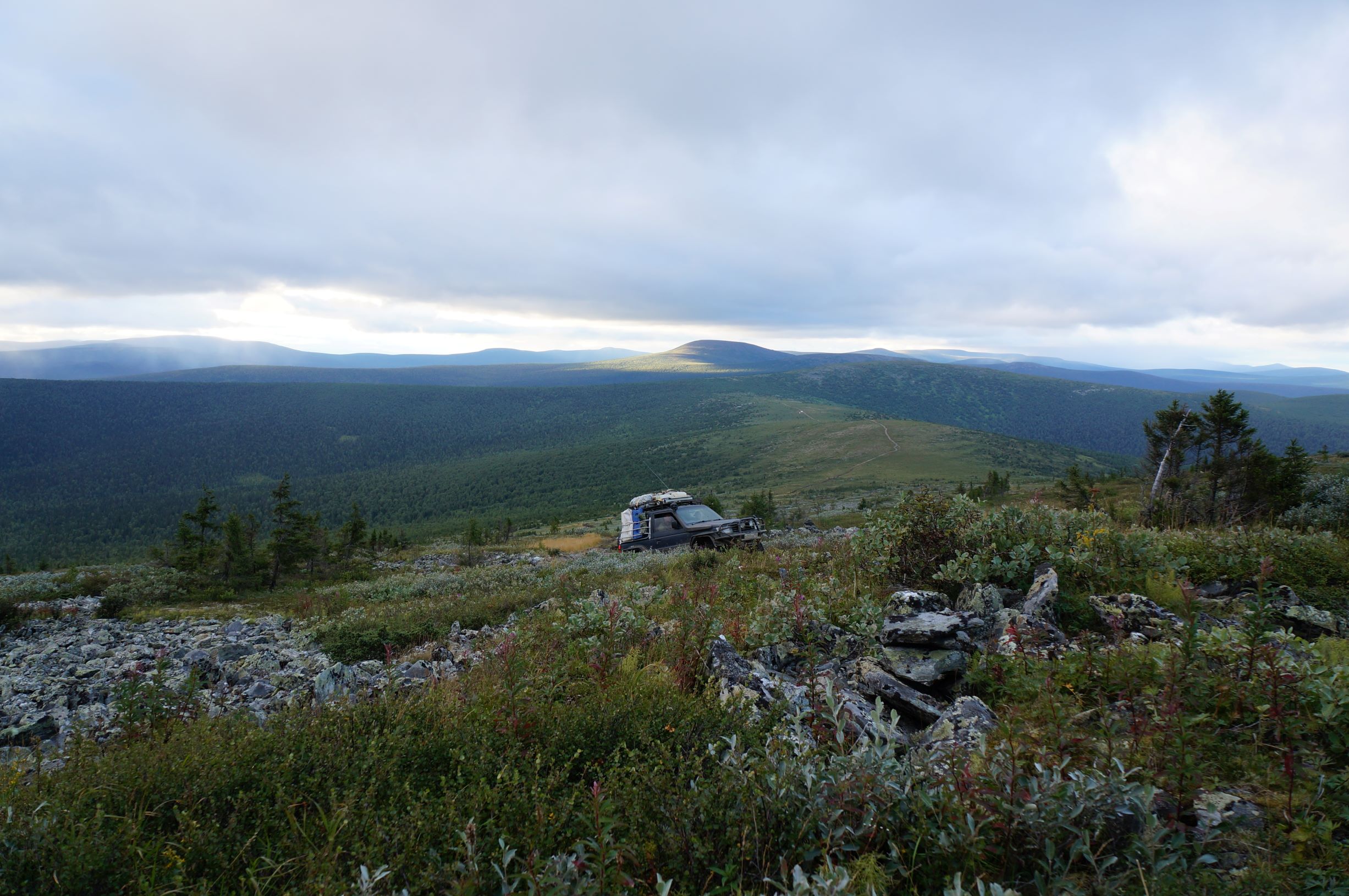 Стоило перемахнуть через гору, как нам встретилась группа из двух Патрулей и Тойоты. Остановились пообщаться. Народ ехал с плато. Доехать то они до него доехали, разрешение на посещение имели, а вот попасть так и не попали – шел сильный дождь и прогулку пришлось отменить. На обратном пути, на курумниках, у еще одной машины из их группы – Сотого Крузака, завернуло кардан и его пришлось бросить. Народ скептически смотрел на Антохин прицеп, уверял, что с ним там вообще не проехать, и вообще лучше туда не соваться – там холодно и плохая дорога… А еще, они видели двух белочек…
