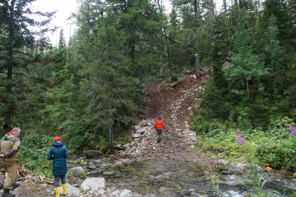 Спуск, потом подъем, и Антоха говорит в рацию, что что-то не так с прицепом. Ищем более-менее ровную площадку и встаем. Осмотр показывает, что лопнул коренной лист рессоры. Все, прицеп дальше не пойдет. Вариантов нет – оставляем его там, где сломался, перегружаем из него в машины все нужное, и оставляем в нем все не нужное. Бензин разливаем по бакам, остальное берем с собой. В прицепе оставляем одну двадцатку на всякий случай. Мусор, который тоже ехал в прицепе оттаскиваем метров на 25, и прижимаем камнями – если мишка придет, чтобы не лез за ним в прицеп. Кроме всего, в самом низу, под фанерным спальником, остаются консервы и крупы. Сверху все это присыпано стульями, сумками с одеждой. В маленькой Шмыге места едва хватает на троих пассажиров и чуть-чуть вещей.
