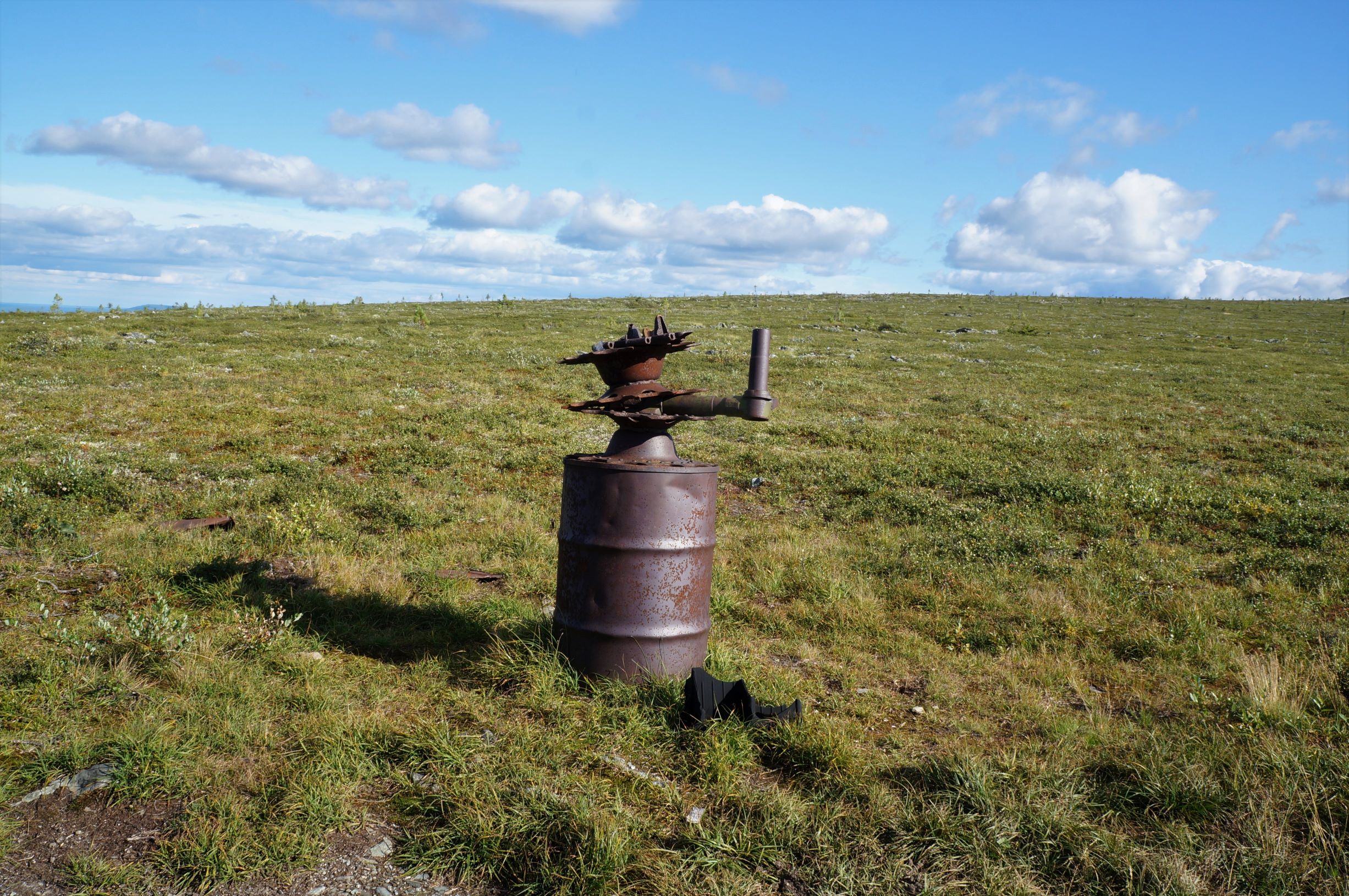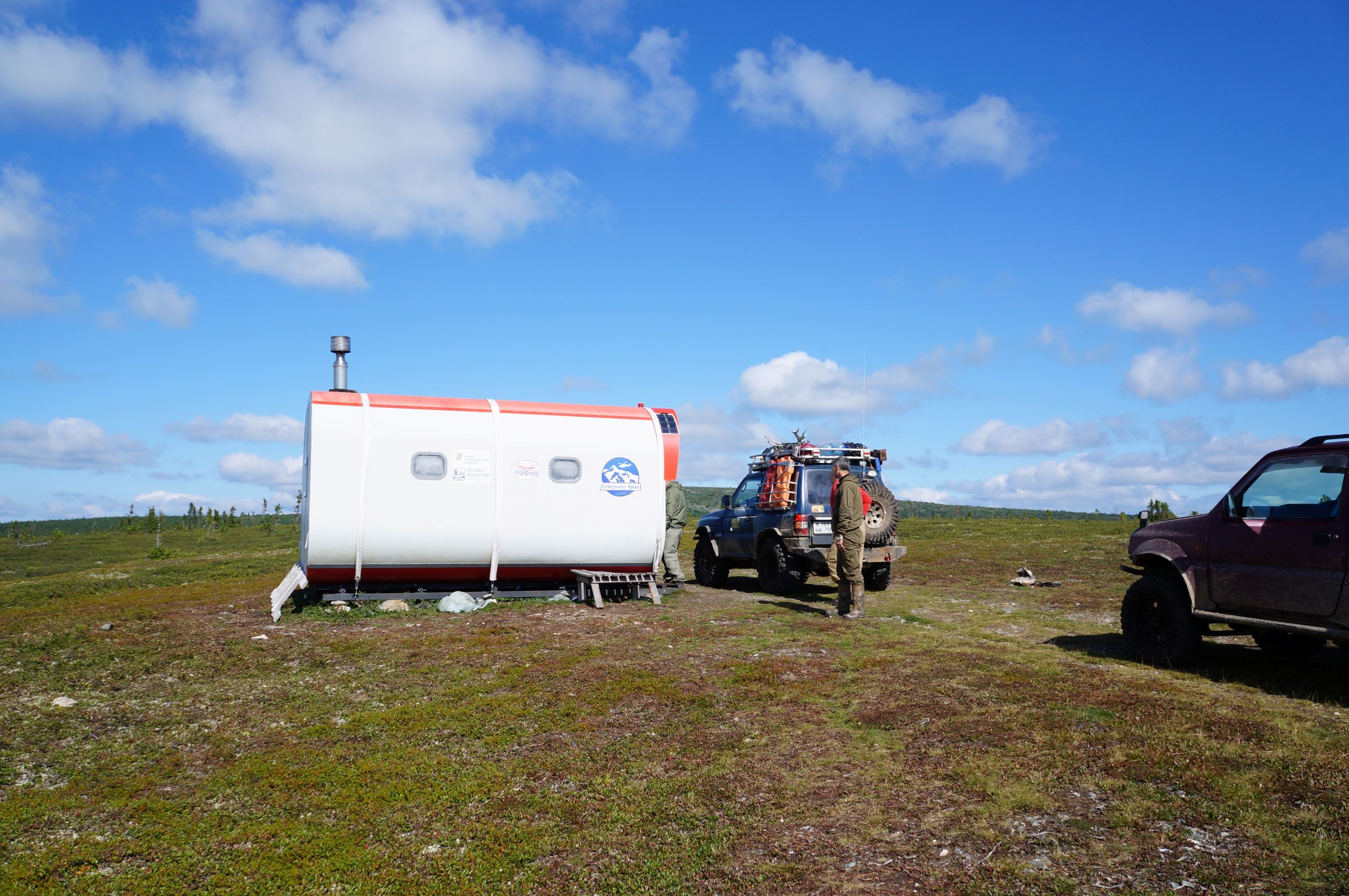 Утро выдалось солнечным, но на верхушки гор периодически налетали облака и тогда мы оказывались в тумане. Поднявшись на следующую по маршруту гору, увидели горные модули, обозначенные на картах как приют «Щебенка». Останавливаться не стали, поехали дальше. Гора «Щебенка» называется так, потому что на вершине горы находится куча мелко колотых камней, такое ощущение, что высыпали огромный КАМАЗ щебня, но скорее всего, когда-то здесь тоже стоял останец, который со временем рассыпался. Дорога идет по вершинам хребта и особых проблем с передвижением нет. Ну иногда встречаются небольшие курумники. Облачность рассеивается и вокруг открываются сногсшибательные виды. Проезжаем какую-то пустую палатку с порванным боком и почти растаявший снежник. Через несколько километров видим еще несколько модулей. Здесь они стоят на самой дороге, и мы остановились, чтобы их рассмотреть. Модули рассчитаны на 8 человек и в них есть необходимый для выживания минимум – печь, соль, спички, аптечка. Отдельно стоит странной формы туалет. Удовлетворив любопытство, отправляемся дальше. С утра мы планировали, что за день постараемся подъехать как можно ближе к Вологодской грани, но дорога относительно хорошая, идем резво, появилась слабая надежда, что доберемся до самого горного лагеря. Правда впереди еще болота…