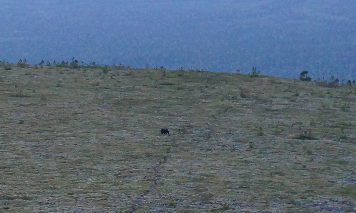Паша рассказал нам, что каждый останец имеет свое название – это Турист, а это Невеста. При должном воображении можно увидеть их очертания. Подходить близко можно только к самому первому, тропа проходит прямо рядом с ним. Разрешается загадать желание и потрогать его на удачу. Оставлять приношения – конфеты, ленточки нельзя – потом из разносит ветром по тундре. Сладости можно оставить егерям… Они там на одних крупах сидят… С погодой нам повезло, и как модно говорить, Пупы нам «открылись». Но темнело очень быстро и нам нужно было идти обратно. Солнце давно село за горизонт и на склон горы вышел медведь, покушать чернички. Это был наш второй мишка. На обратном пути зайцы разбегались у нас из-под ног, а Серый, как уже говорилось выше, описал двух из них.