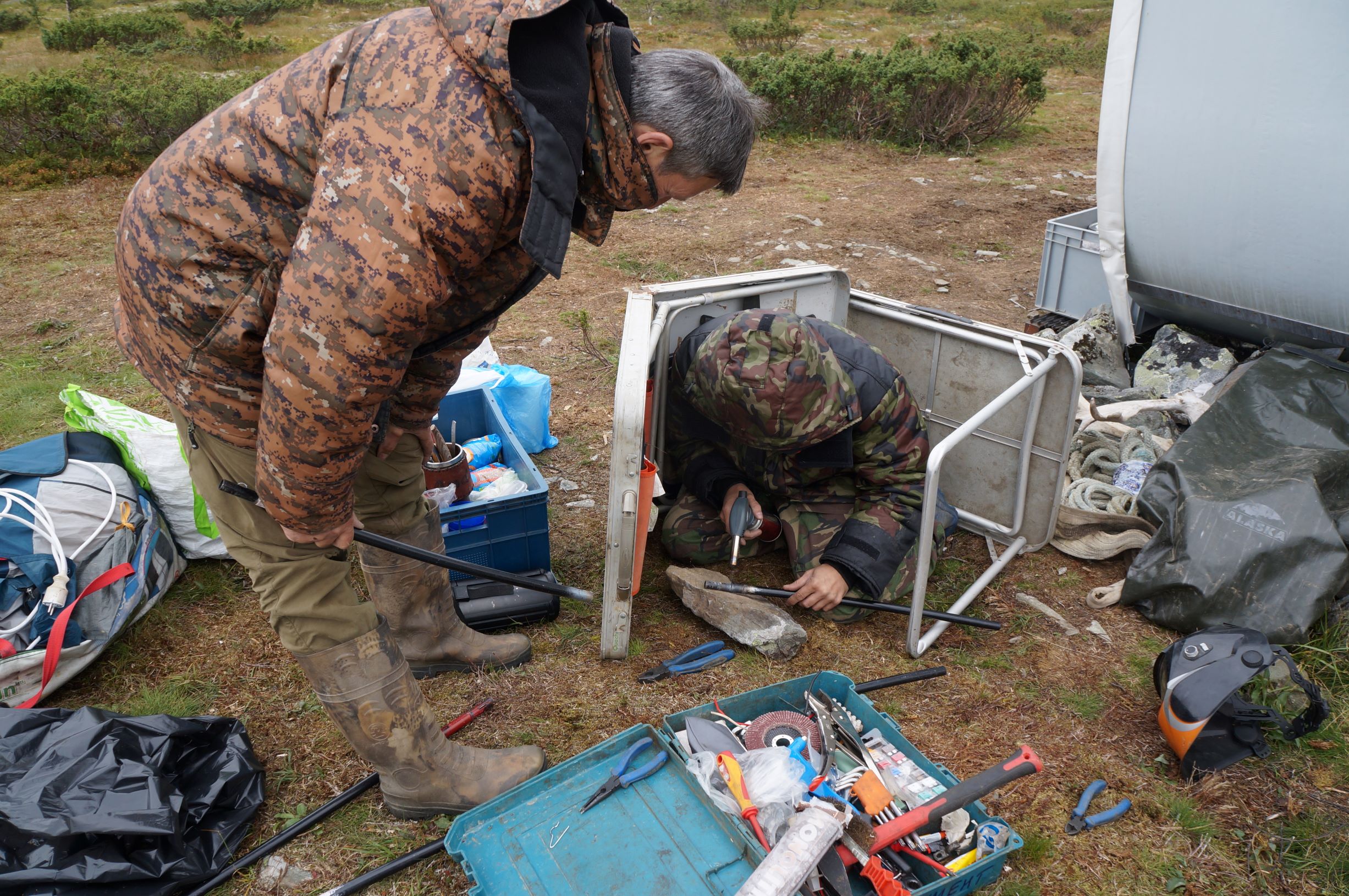 Расположились мы в модулях очень уютно. Крохотные домики, привезенные сюда на вертолётах, предназначены для остановки в них всеми нуждающимися. На стенах висят инструкции по пользованию домиком и печкой. Есть веник, аптечка, соль, спички, пара конфеток. И самое главное – на крыше расположена солнечная батарея, которая питает лампочку и USB порт. Антоха не успокоился, пока не починил везде свет, который почему-то не хотел гореть. По идее, раз в неделю должен прилетать вертолет, привозить топливные брикеты и забирать несгораемый мусор, который положено складывать в мешки и прижимать камнями, но мы его так и не увидели. Метрах в 150 течет маленький ручеек, в котором можно набрать воды.