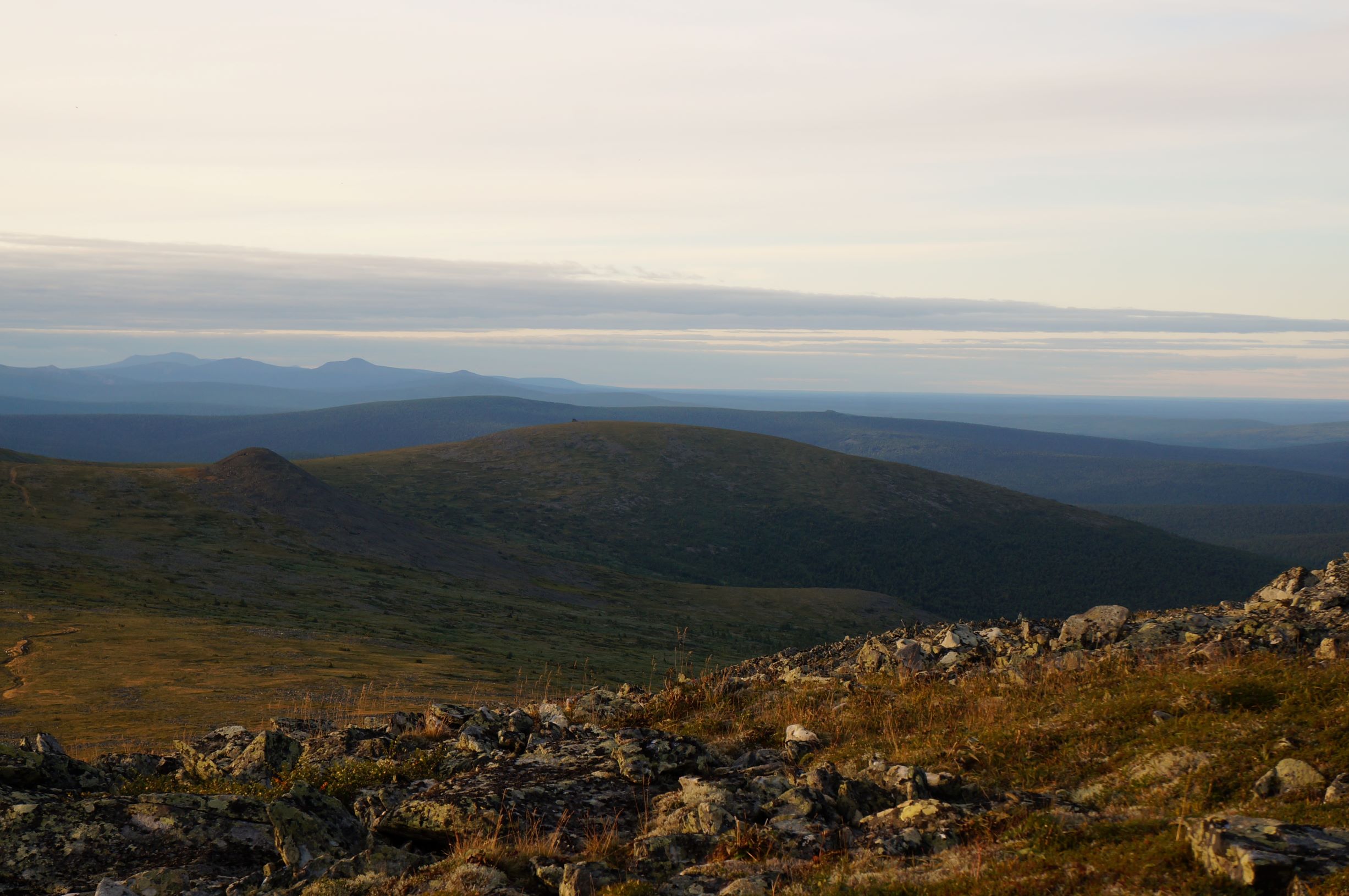 Тропа, отсыпанная щебенкой только на вершине горы, все остальное - обычная тропинка по лесу и курумникам. Но сейчас там строят странное сооружение, называемое мостом. На вбитые в землю металлические опоры делают дощатый настил на высоте примерно 60 см над землей. Доски кладут под шаг, что удобно, но, если ты оступился, прощай ноги. Перил тоже нет… Говорят, потом застелют сплошняком, а пока работают на метраж. Стоимость погонного метра называют заоблачную, даже писать не буду, с учетом того, что работают волонтеры бесплатно. Итак, дорогу на плато мы прошли более-менее легко и пришли точно к закату. В домике нас ждал проводник Паша. Он рассказал нам правила и повел к останцам. Во всех отчетах народ пишет про эмоции, охватывающие при виде них… Наверное, они бы у меня тоже были, если бы не усталость. Ну да, порадовались, по фоткали, но не того совершенно ждали.