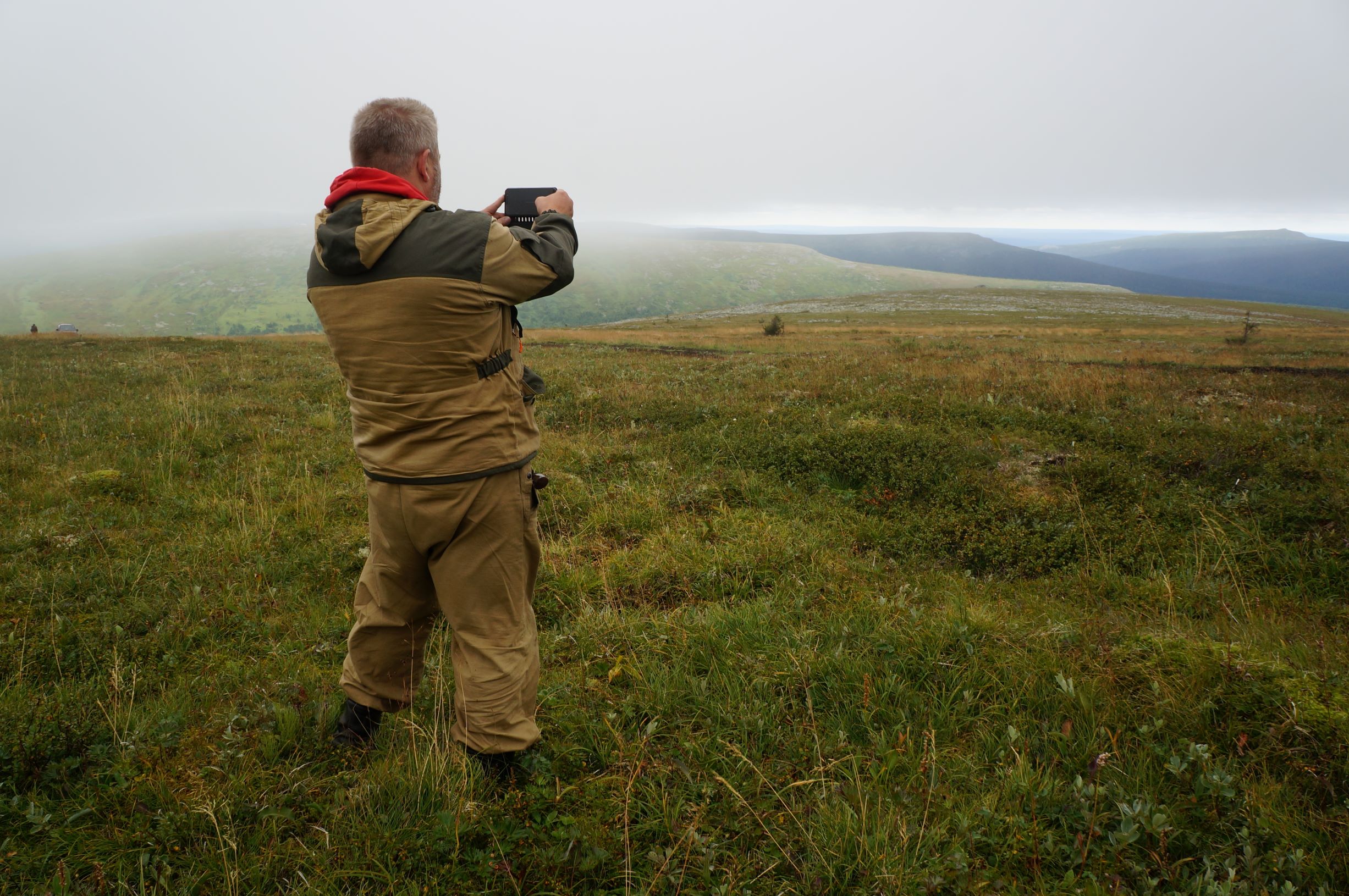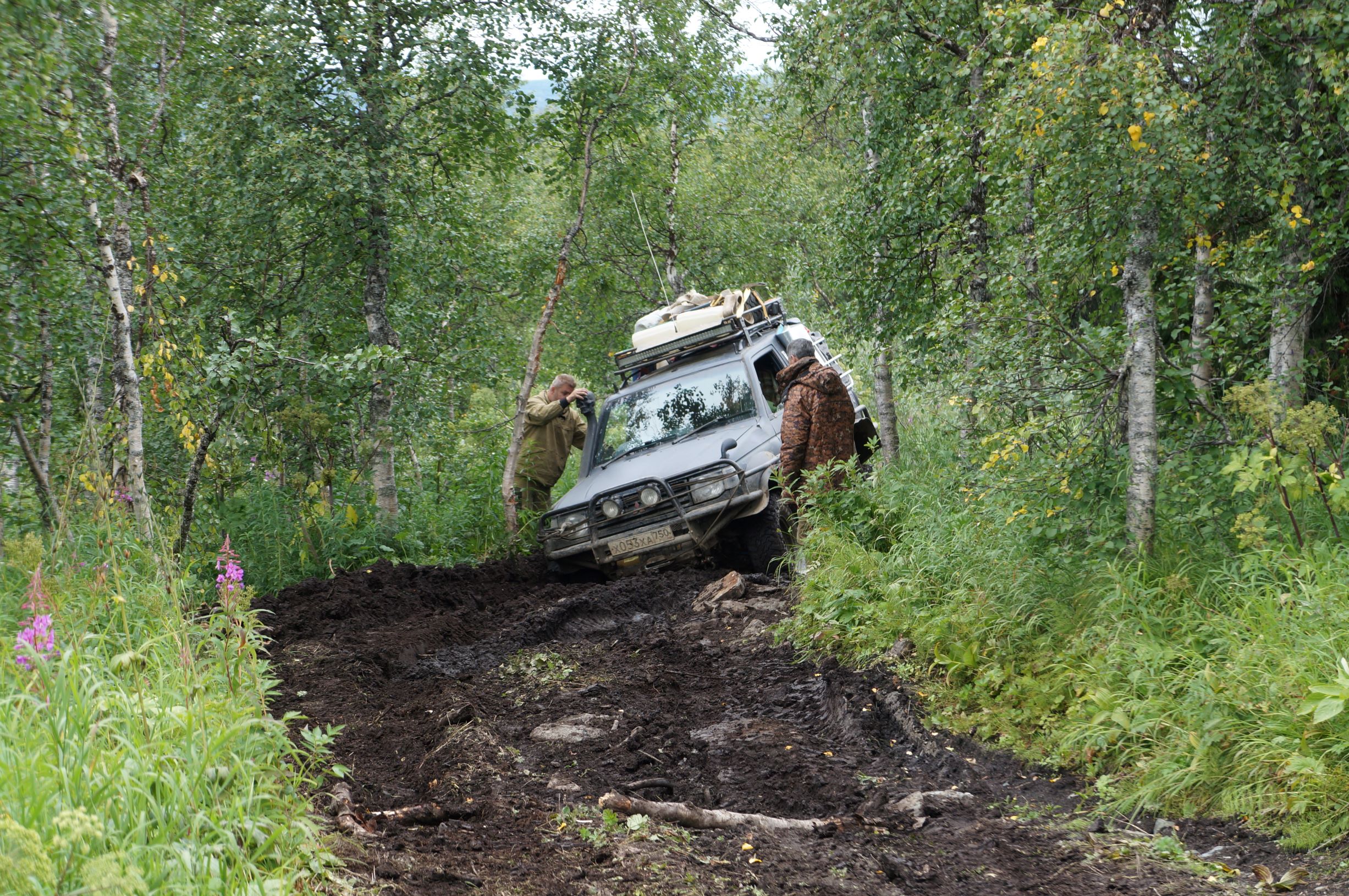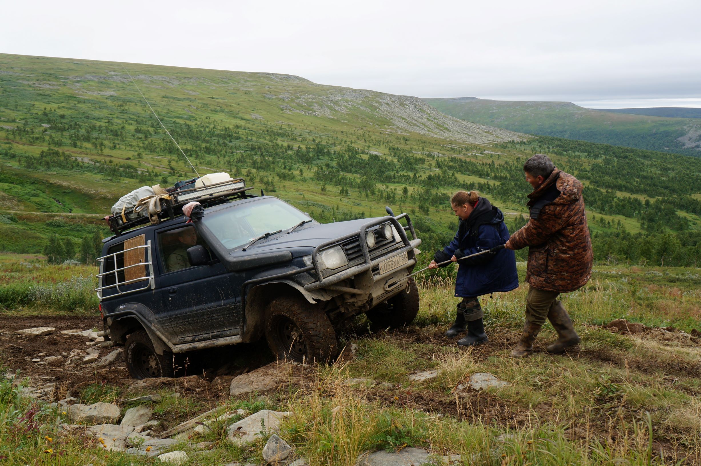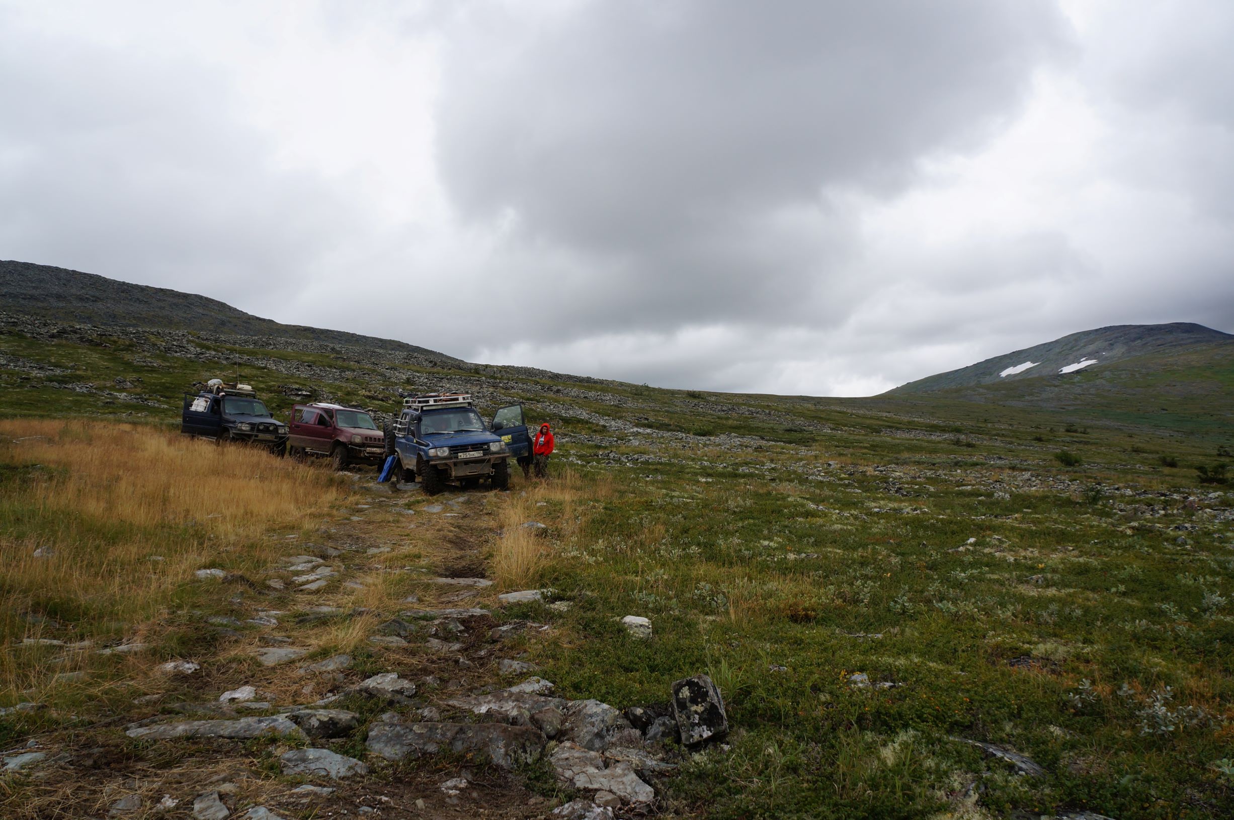 Распрощавшись, поехали дальше. Дорога шла по склону горы, и крен, вызванный рельефом, усугублялся полными бензина канистрами в боковых корзинах. Глядя вниз, и прикидывая предположительную траекторию полета машины, в случае падения, становилось не по себе. Ситуацию подогревала карта, с отметками мест, где уже кто-то когда-то переворачивался… Опыт езды по горам и курумникам у нас совсем небольшой, поэтому было страшновато. Но постепенно, волей-неволей мы привыкали к новому для нас стилю езды. Все понимали, что главное не торопиться и беречь машины. Накрапывающий дождик делал камни скользкими и добавлял остроты ощущений. Верхушки гор кутались в облака, где-то справа остался Отортен.