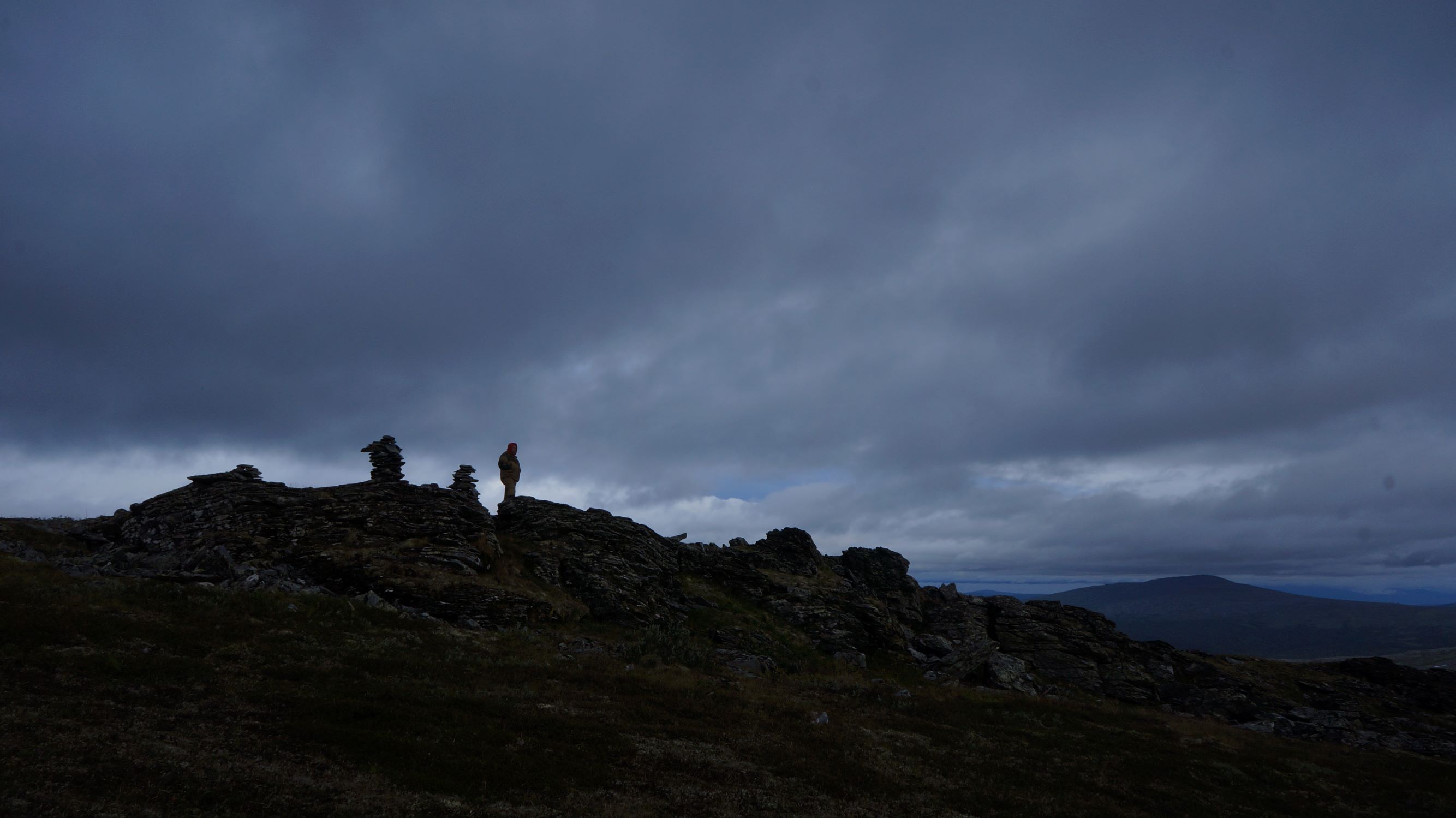 И спуск с горы… На мой взгляд это самый сложный участок. Сильные крены и курумник из крупных камней. Здесь как раз и стояла брошенная сотка с завернутым карданом. А вдалеке виднелись останцы МаниПуни.