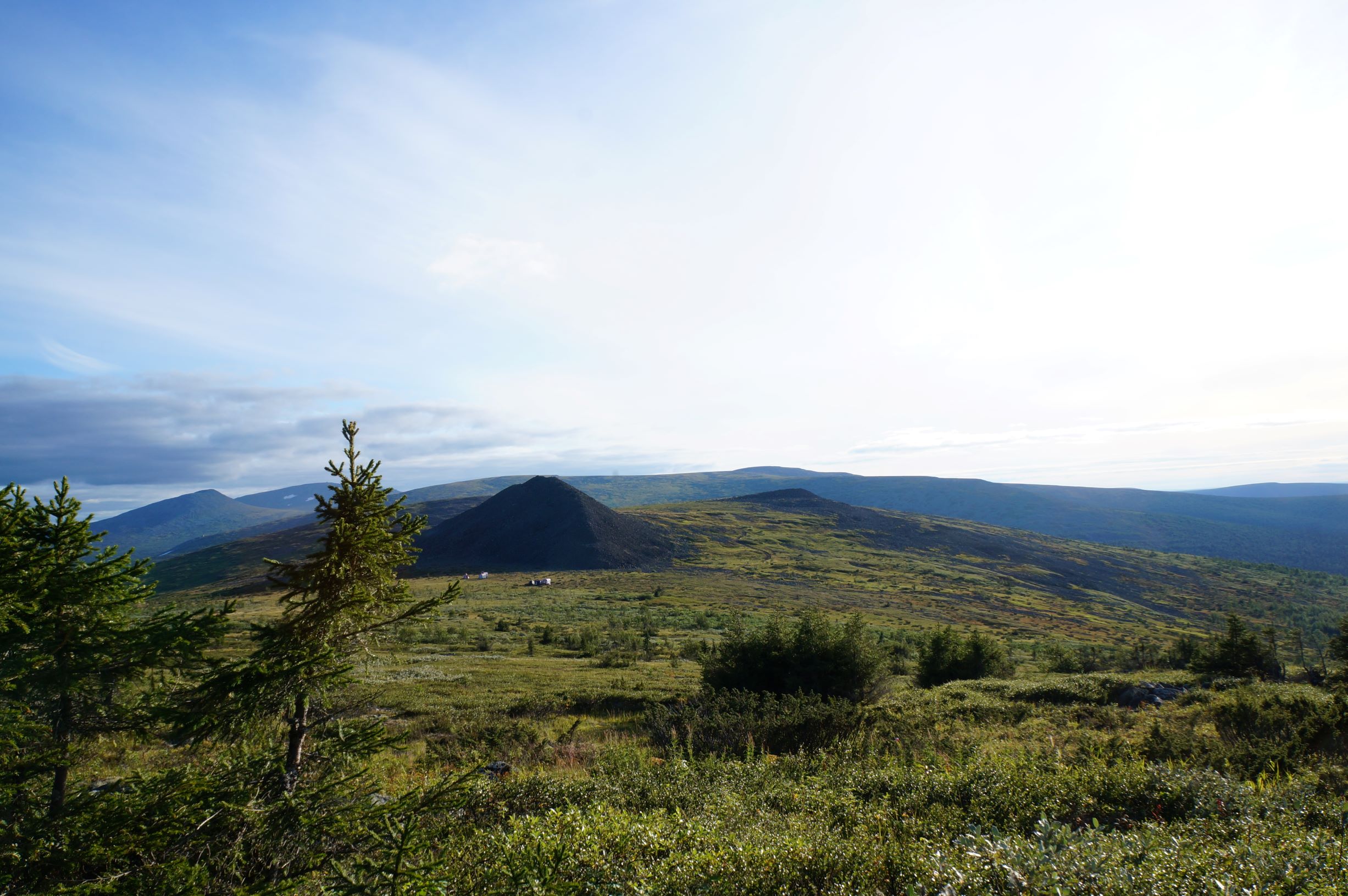 Утро выдалось солнечным, но на верхушки гор периодически налетали облака и тогда мы оказывались в тумане. Поднявшись на следующую по маршруту гору, увидели горные модули, обозначенные на картах как приют «Щебенка». Останавливаться не стали, поехали дальше. Гора «Щебенка» называется так, потому что на вершине горы находится куча мелко колотых камней, такое ощущение, что высыпали огромный КАМАЗ щебня, но скорее всего, когда-то здесь тоже стоял останец, который со временем рассыпался. Дорога идет по вершинам хребта и особых проблем с передвижением нет. Ну иногда встречаются небольшие курумники. Облачность рассеивается и вокруг открываются сногсшибательные виды. Проезжаем какую-то пустую палатку с порванным боком и почти растаявший снежник. Через несколько километров видим еще несколько модулей. Здесь они стоят на самой дороге, и мы остановились, чтобы их рассмотреть. Модули рассчитаны на 8 человек и в них есть необходимый для выживания минимум – печь, соль, спички, аптечка. Отдельно стоит странной формы туалет. Удовлетворив любопытство, отправляемся дальше. С утра мы планировали, что за день постараемся подъехать как можно ближе к Вологодской грани, но дорога относительно хорошая, идем резво, появилась слабая надежда, что доберемся до самого горного лагеря. Правда впереди еще болота…