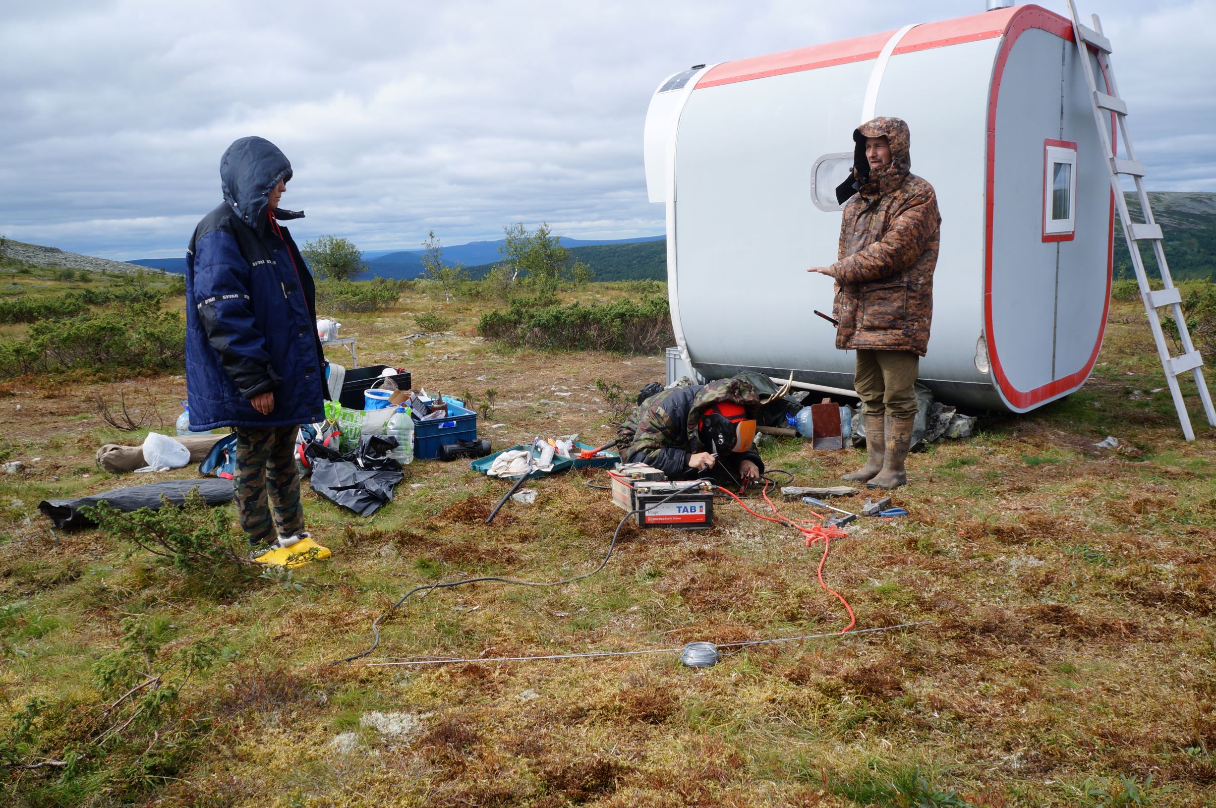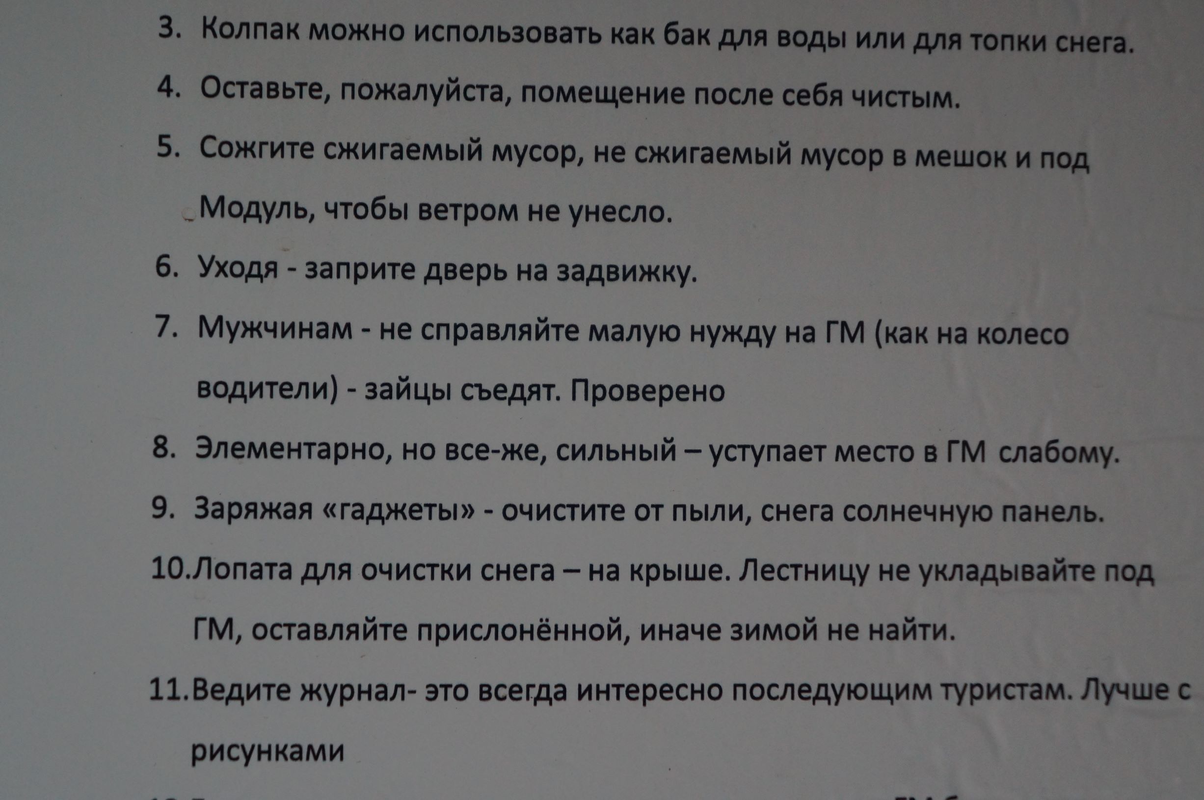 Расположились мы в модулях очень уютно. Крохотные домики, привезенные сюда на вертолётах, предназначены для остановки в них всеми нуждающимися. На стенах висят инструкции по пользованию домиком и печкой. Есть веник, аптечка, соль, спички, пара конфеток. И самое главное – на крыше расположена солнечная батарея, которая питает лампочку и USB порт. Антоха не успокоился, пока не починил везде свет, который почему-то не хотел гореть. По идее, раз в неделю должен прилетать вертолет, привозить топливные брикеты и забирать несгораемый мусор, который положено складывать в мешки и прижимать камнями, но мы его так и не увидели. Метрах в 150 течет маленький ручеек, в котором можно набрать воды.