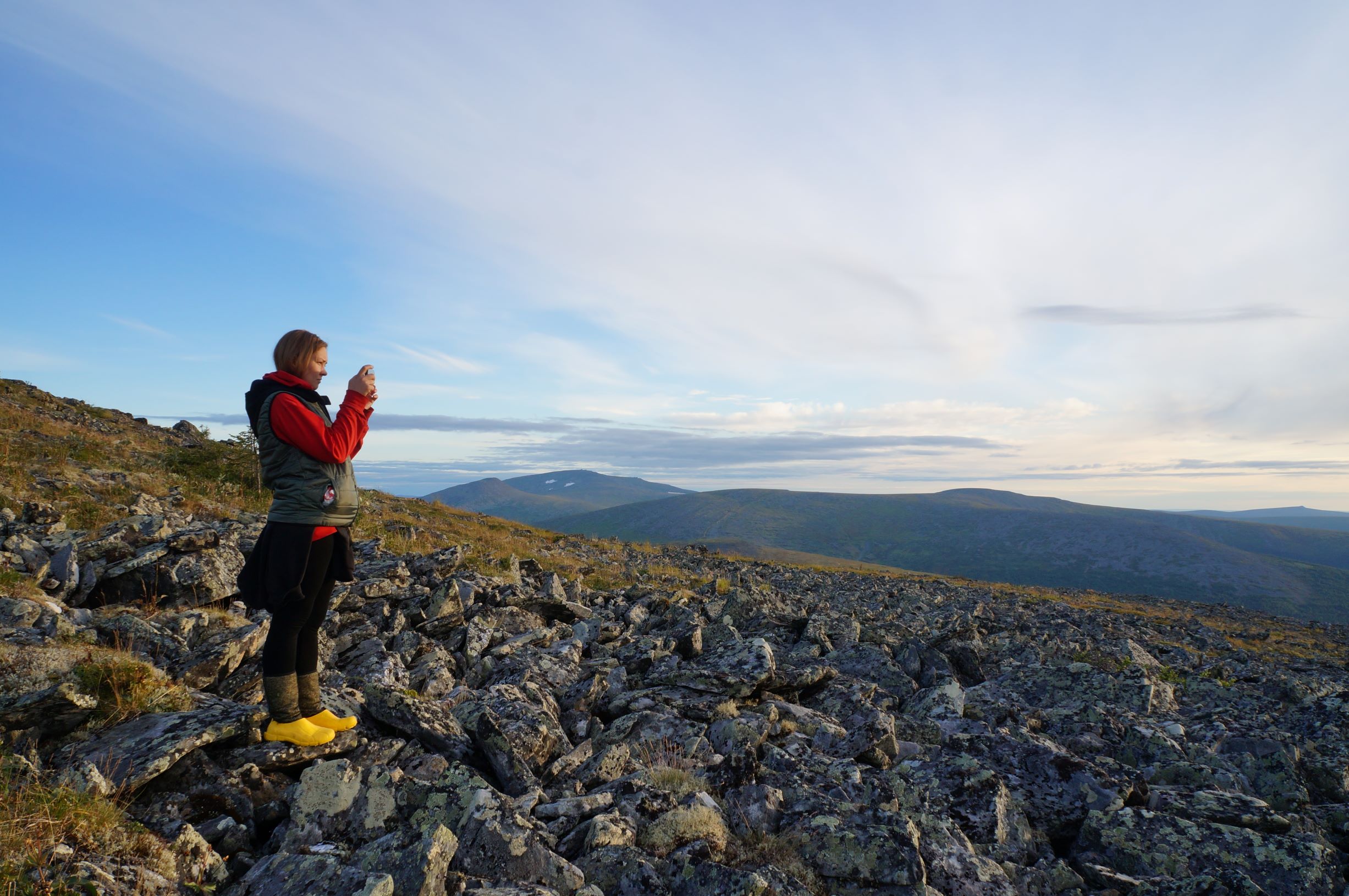 Тропа, отсыпанная щебенкой только на вершине горы, все остальное - обычная тропинка по лесу и курумникам. Но сейчас там строят странное сооружение, называемое мостом. На вбитые в землю металлические опоры делают дощатый настил на высоте примерно 60 см над землей. Доски кладут под шаг, что удобно, но, если ты оступился, прощай ноги. Перил тоже нет… Говорят, потом застелют сплошняком, а пока работают на метраж. Стоимость погонного метра называют заоблачную, даже писать не буду, с учетом того, что работают волонтеры бесплатно. Итак, дорогу на плато мы прошли более-менее легко и пришли точно к закату. В домике нас ждал проводник Паша. Он рассказал нам правила и повел к останцам. Во всех отчетах народ пишет про эмоции, охватывающие при виде них… Наверное, они бы у меня тоже были, если бы не усталость. Ну да, порадовались, по фоткали, но не того совершенно ждали.