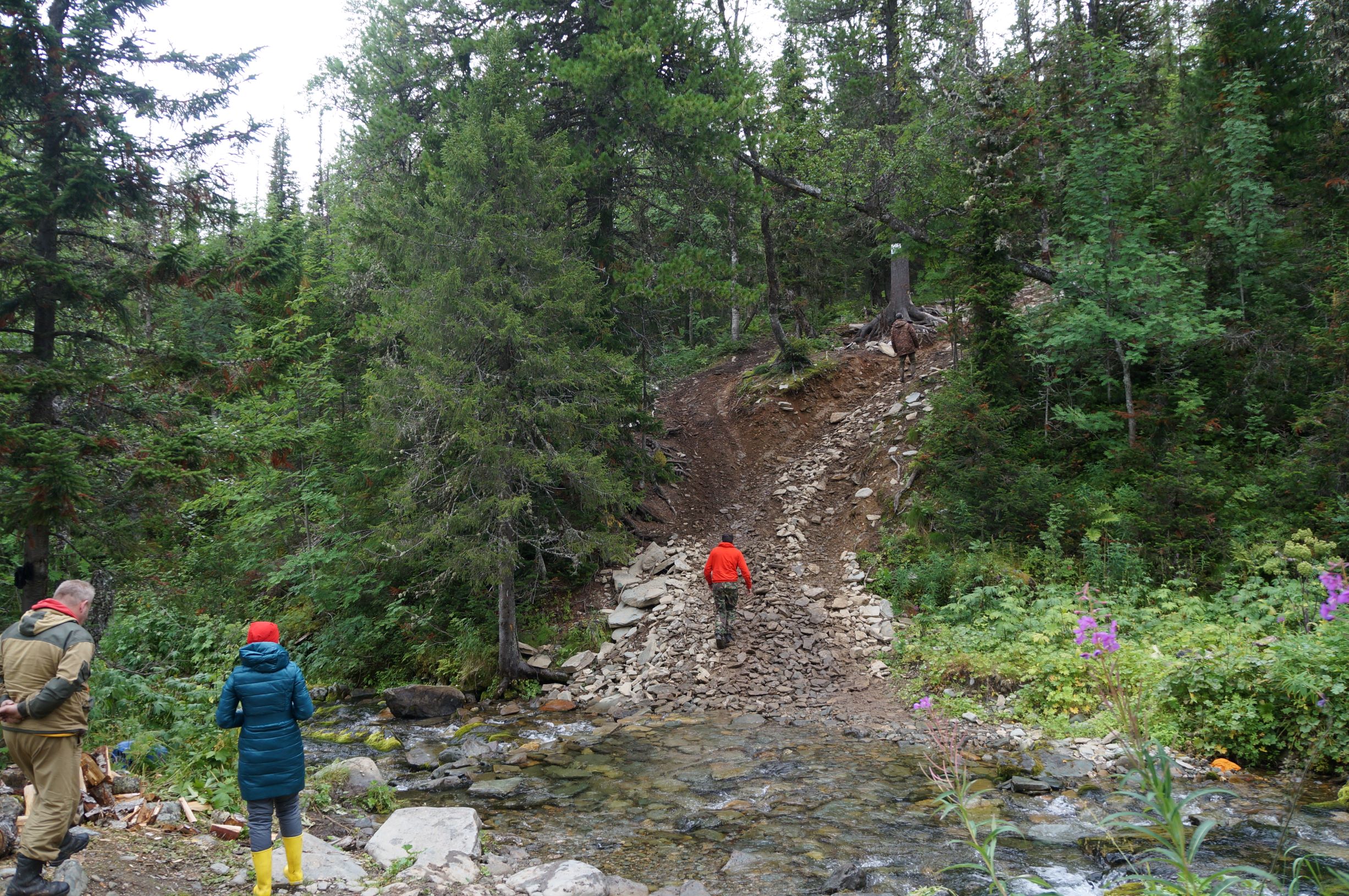 Тропа, отсыпанная щебенкой только на вершине горы, все остальное - обычная тропинка по лесу и курумникам. Но сейчас там строят странное сооружение, называемое мостом. На вбитые в землю металлические опоры делают дощатый настил на высоте примерно 60 см над землей. Доски кладут под шаг, что удобно, но, если ты оступился, прощай ноги. Перил тоже нет… Говорят, потом застелют сплошняком, а пока работают на метраж. Стоимость погонного метра называют заоблачную, даже писать не буду, с учетом того, что работают волонтеры бесплатно. Итак, дорогу на плато мы прошли более-менее легко и пришли точно к закату. В домике нас ждал проводник Паша. Он рассказал нам правила и повел к останцам. Во всех отчетах народ пишет про эмоции, охватывающие при виде них… Наверное, они бы у меня тоже были, если бы не усталость. Ну да, порадовались, по фоткали, но не того совершенно ждали.