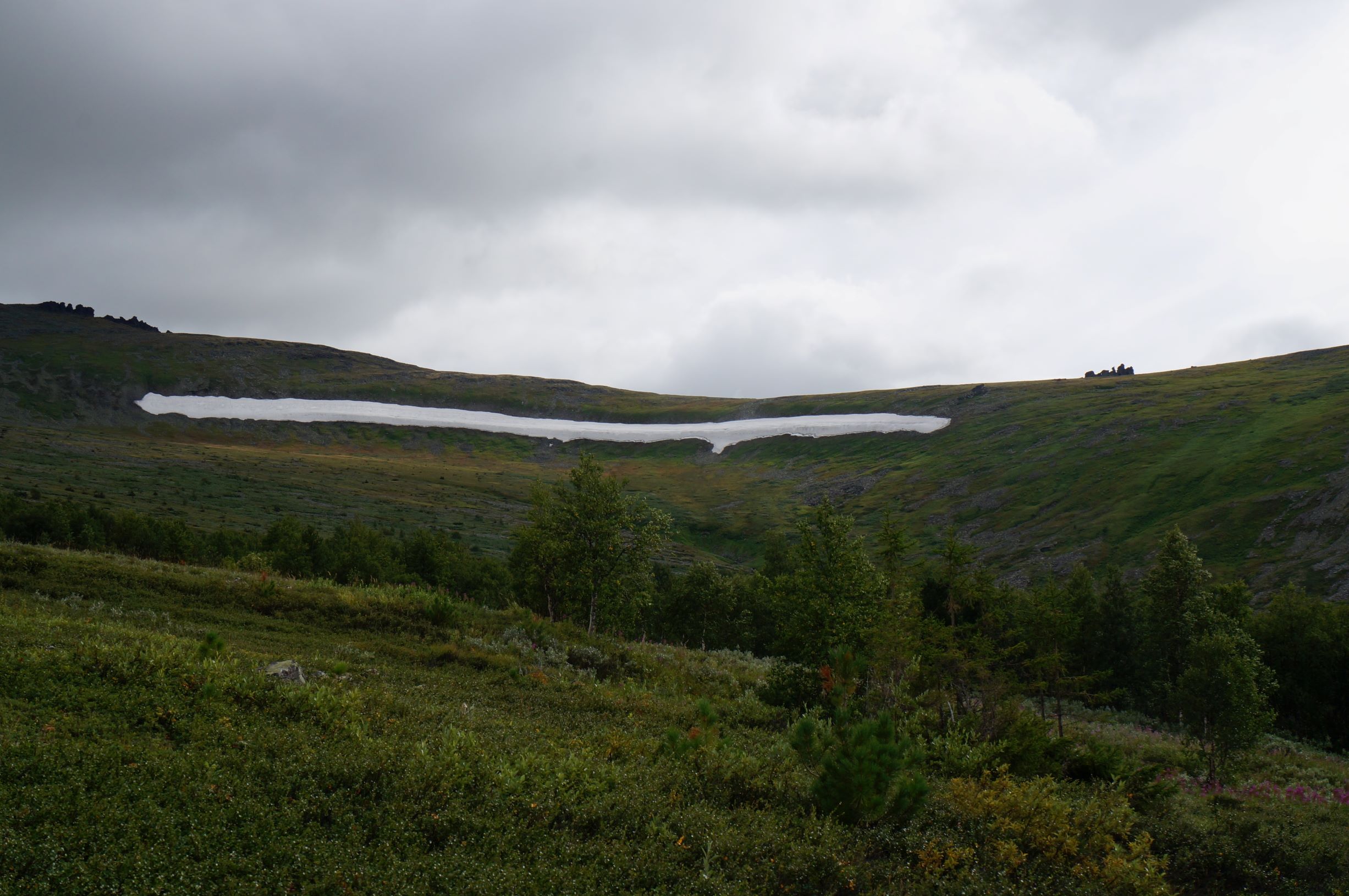 Наверху открывается шикарный вид на горы вдали и длинный снежник. А также стоит табличка, предупреждающая, что мы въезжаем в буферную зону Печоро-Илычского заповедника.