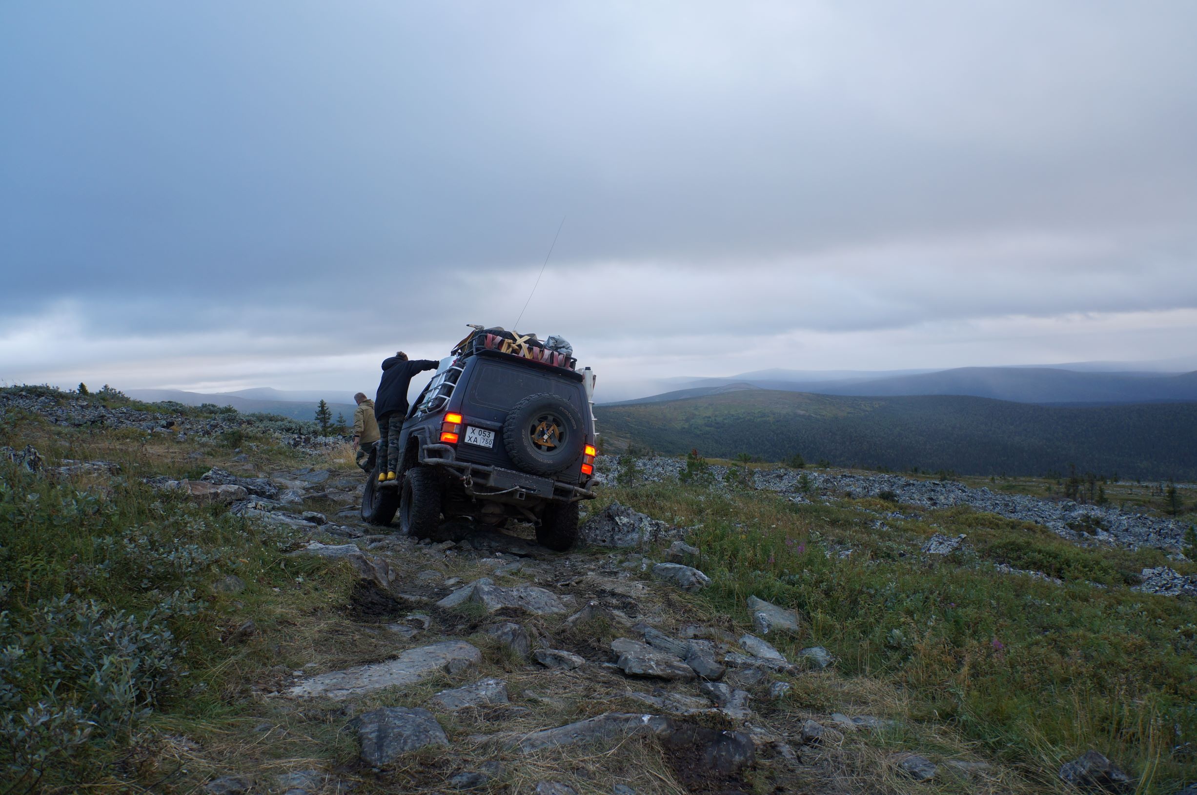Распрощавшись, поехали дальше. Дорога шла по склону горы, и крен, вызванный рельефом, усугублялся полными бензина канистрами в боковых корзинах. Глядя вниз, и прикидывая предположительную траекторию полета машины, в случае падения, становилось не по себе. Ситуацию подогревала карта, с отметками мест, где уже кто-то когда-то переворачивался… Опыт езды по горам и курумникам у нас совсем небольшой, поэтому было страшновато. Но постепенно, волей-неволей мы привыкали к новому для нас стилю езды. Все понимали, что главное не торопиться и беречь машины. Накрапывающий дождик делал камни скользкими и добавлял остроты ощущений. Верхушки гор кутались в облака, где-то справа остался Отортен.
